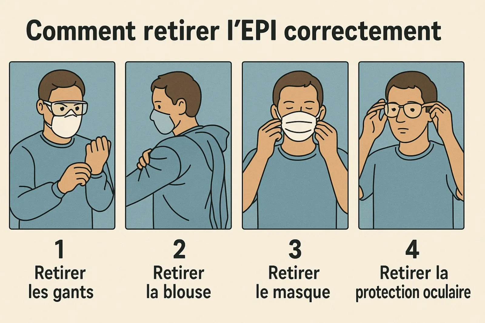 Ces visuels illustrent les étapes essentielles : retrait des gants, de la blouse, du masque, désinfection des mains, etc., selon les protocoles hospitaliers en vigueur. Cela évite les erreurs de manipulation, surtout dans les zones de déshabillage ou sas de sortie.